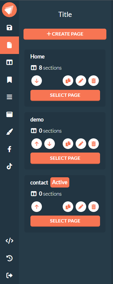 After you have made several pages you can click on the pages icon again to edit every individual page. Click on "MODIFY" to edit the slug and page name. Click on "SELECT PAGE" to start editing the page.