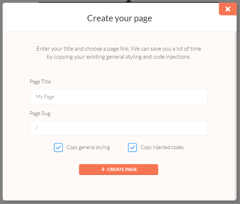 Click on create page to add a new page, you will be asked to name your page and to enter the slug. The slug will be the extension of the URL of where your page can be found after you have published it.