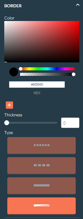 In the border settings, you are able to add and edit the border of your button. You are able to change the color, the thickness and the type of the border.