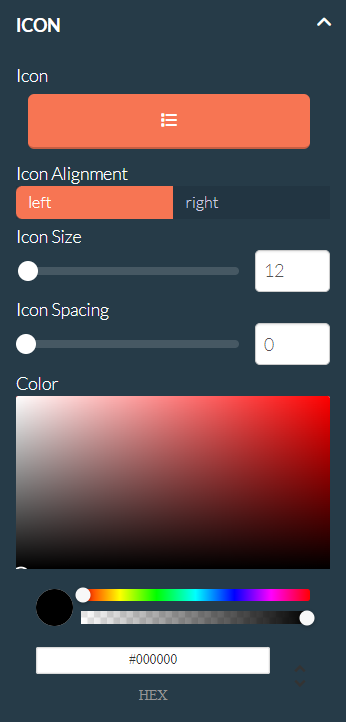 With this setting you are able to add an icon from our icon library to your button. You are also able to edit the alignment, the size, the spacing and the color of this icon.