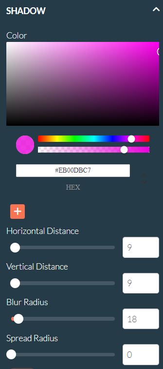 Here you can add and edit the button's shadow. You are able to select any color for the background, the horizontal and vertical distance, how blurred the shadow is and the spread radius (the size of the shadow).