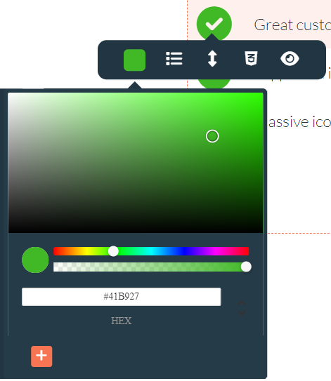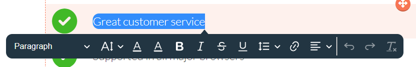 With the icon text option within an element, you can add icons combined with a text field. This way, you are able to make a summary of your product's or service's benefits. You can add text to an icon to make your benefits more clear. With the search function, you can find almost any icon you'd like. Momentarily it isn't possible to upload your own icon.