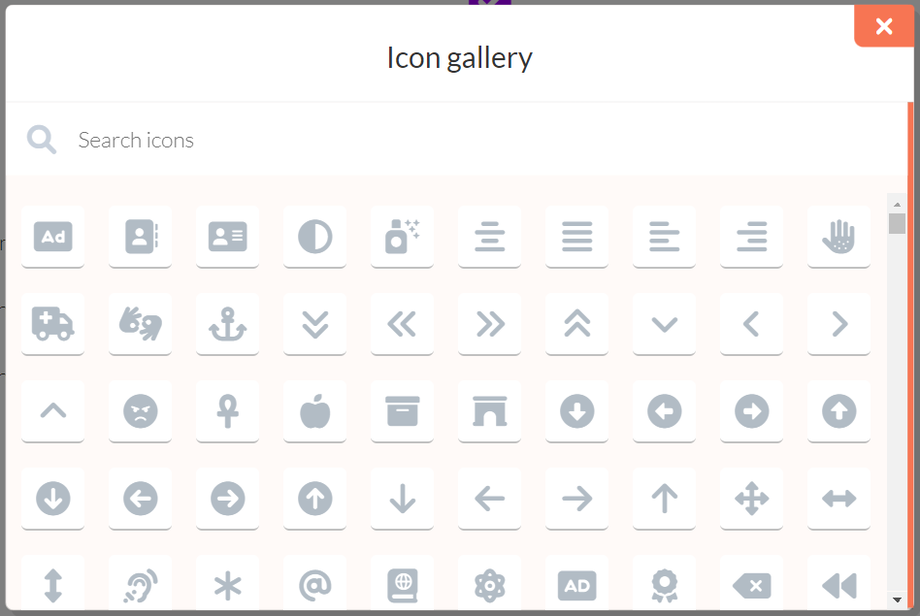 By clicking the list icon, you can choose any icon you want from our icon gallery. You can either scroll through the gallery to search for the right icon, or use the search option.