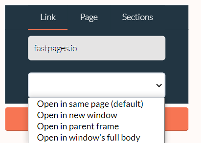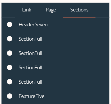 Once in the menu items you can choose between a link, a page and a section. With the Link option you can choose a URL to add to the menu, and you can choose how this link will be opened for the user. With the Page option you can choose any page from within your current project. With the Sections option you can choose any section from the current page.