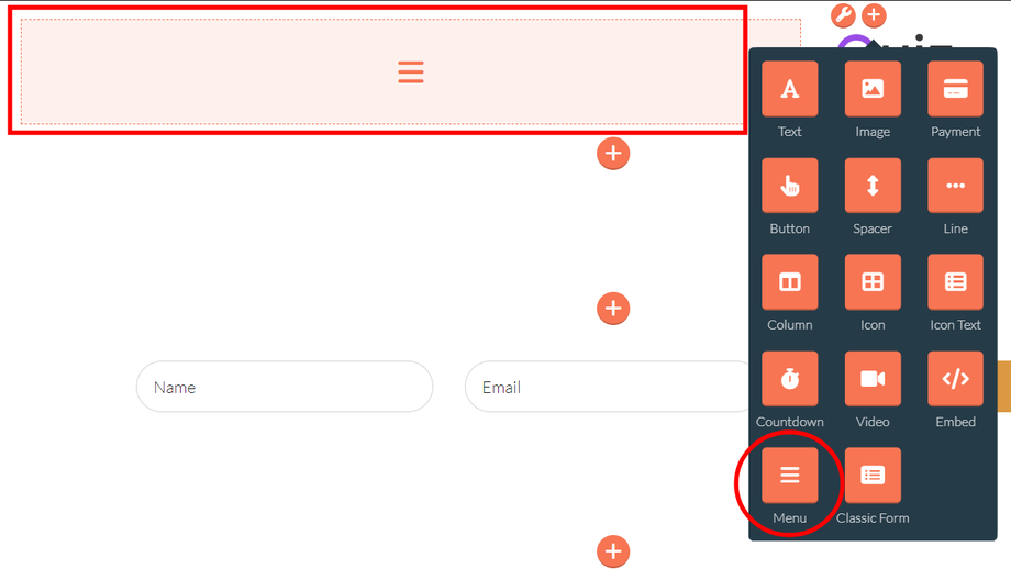 Note: The menu will mostly show up in the header if you have added a header. If you don't have a header on your page or haven't added the menu item yet. The menu will not show up. In the editor the menu looks like this: