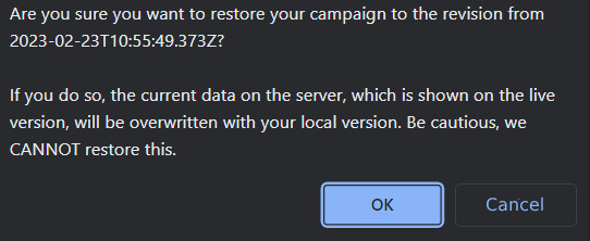 Before restoring you have to accept the alert button telling you that this process can not be reverted. This is also the case we will never be able to revert to your latest version if you do this.
