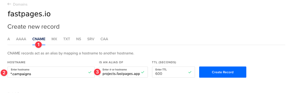 5. Make sure you add projects.fastpages.app(3) as a value and enter your subdomain name by name. In this case it will be *.campaigns (2).