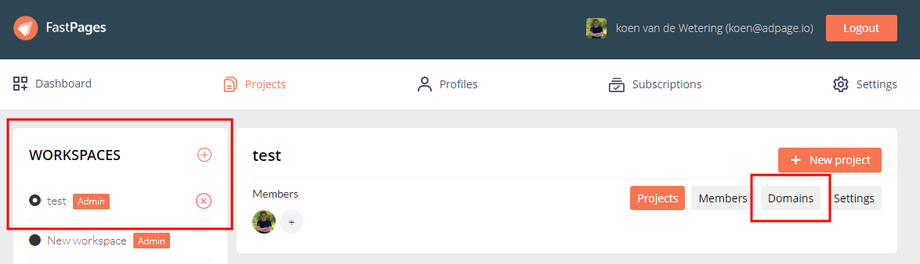 1. Go to projects and select the workspace where you want to add the subdomain name. Click Domains.