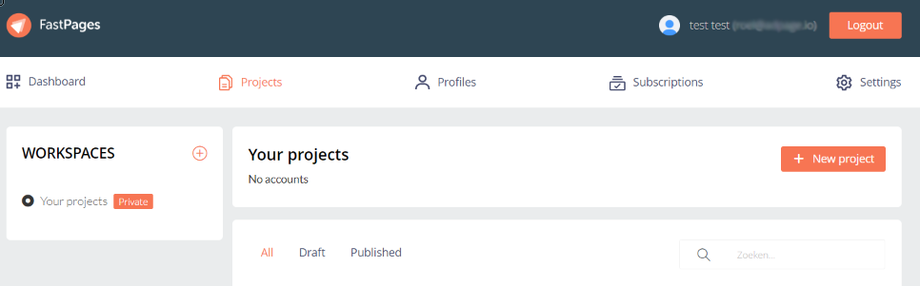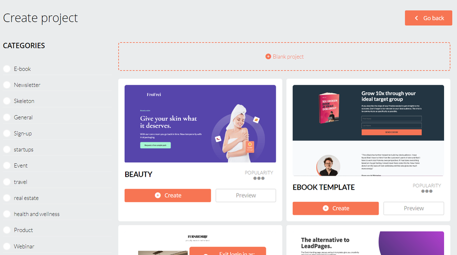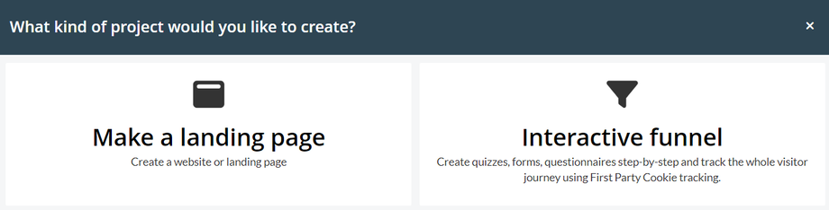 After that you can start from scratch by clicking on ''Blank project'' or you can choose between different blueprints. By clicking on one of the blueprints you can start editing the page in that style within the editor. When starting with a blank project you can start adding sections by clicking on the plus icon button.