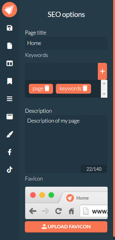 When clicking this icon a panel will show up with the SEO settings for your project. You can change the page title, keywords, description, favicon, OG-image and whether your project can be indexed.